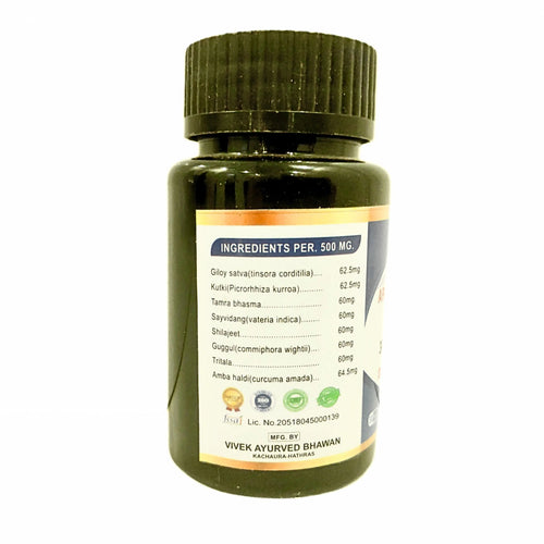 2. Aarogya Vardhani Vati consists of ingredients like Giloy Satva, Kutki, Tamra Bhasma, Sayvidang, Shilajeet, Guggul, Trifala, Amba Haldi.