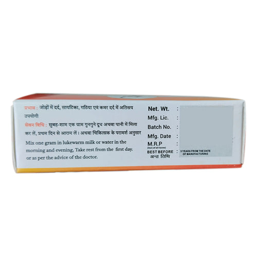 Ingredients: It consists of Siddha Kuchla, Siddha Bhilava, Amla, Harda, Baheda, Saunth, Amba Haldi, Pipal lakh, Nagar Motha, Methi, Maal Sindoor, Hing, Ajmoda, Black Piper, Ashwagandha.