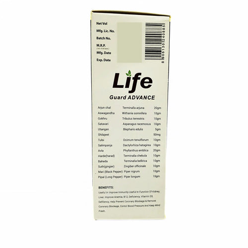 3. Life Guard Advance Syrup: It consists of Arjun Chal, Aswagandha, Gokhru, Satvari, Utangan, Shilajeet, Tulsi, Salimpanja, Amla, Harde, Baheda, Suth, Mari, Pipal.