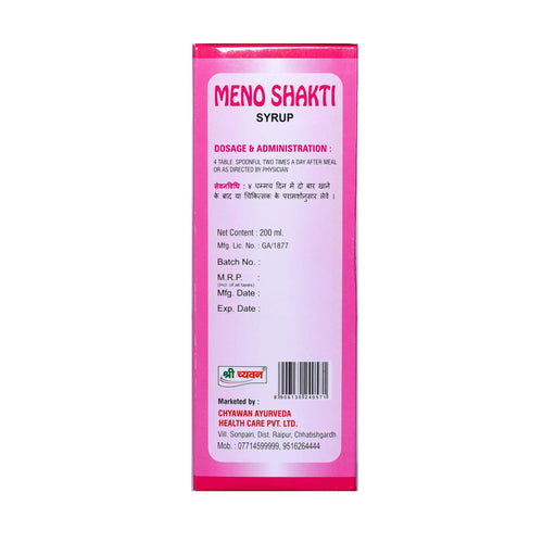 3. Menoshakti Syrup: Helps in irregular periods and hormonal imbalance. It helps to maintain estrogen levels, considerably reduces stress and anxiety, and reduces hot flashes and night sweats.